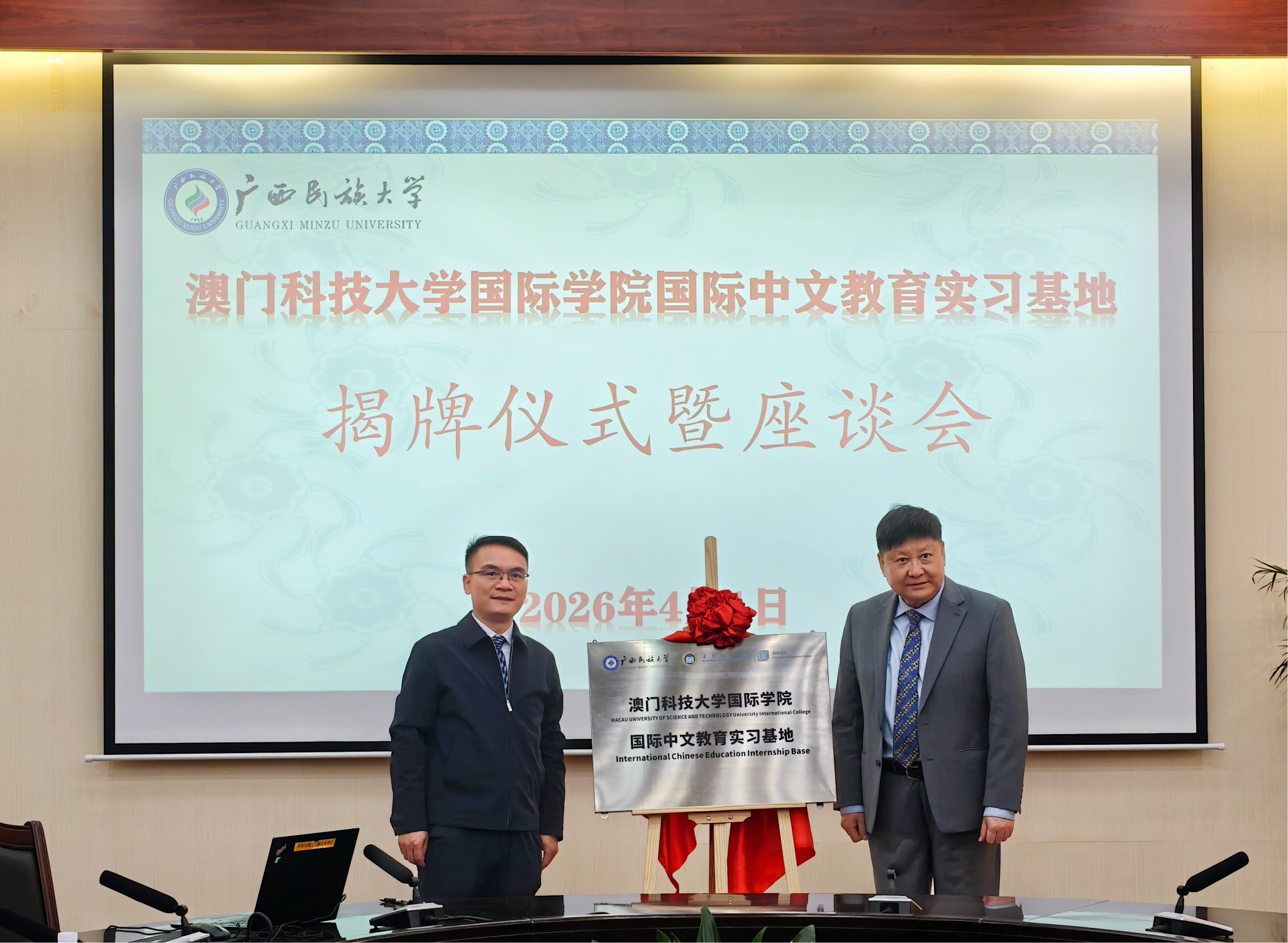 4月1日上午,澳门科技大学国际中文教育实习基地揭牌仪式暨座谈会在广西民族大学国际交流合作处一楼大会议室顺利举行。澳门科技大学国际学院院长张洪明教授、广西民族大学国际教育学院党委书记张宏宇共同为实习基地揭幕。澳门科技大学国际学院研究生课程主任尤舒翔博士及广西民族大学国际合作与交流处(国际教育学院)副处长(副院长)牟永红出席了此次揭幕仪式。